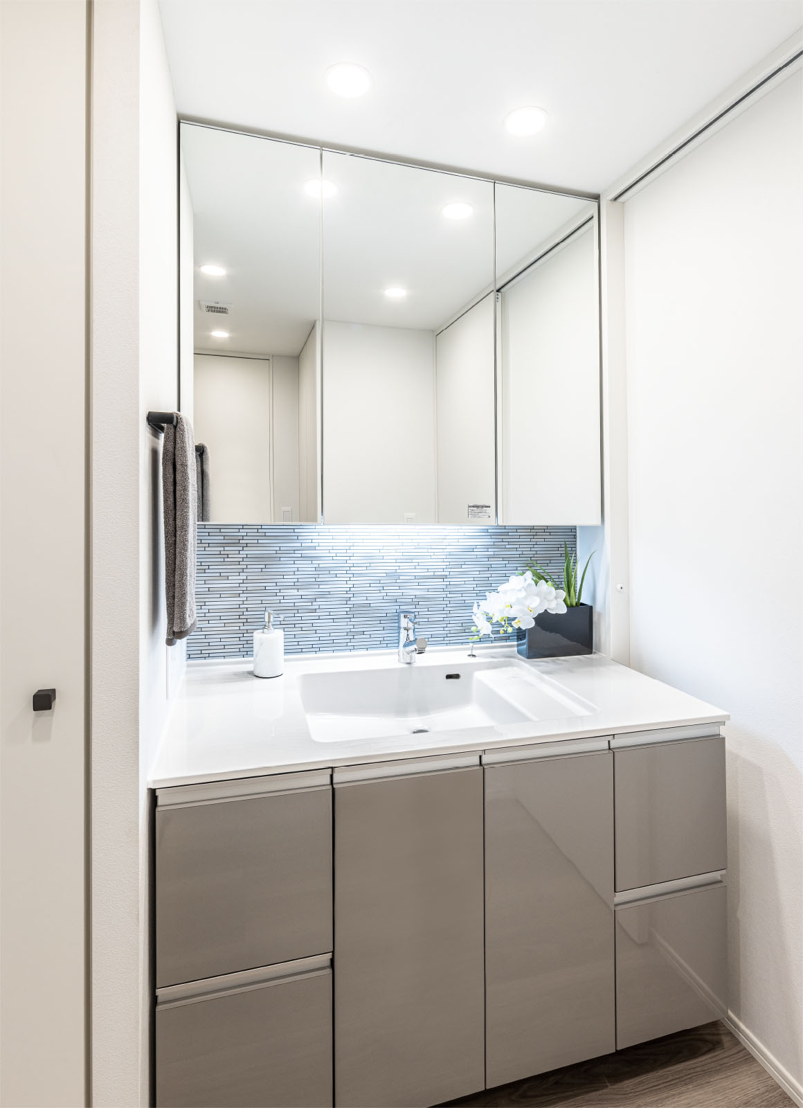 三面鏡センターミラーの表面に吸水性・親水性のある膜をコーティング。全面がくもりにくい仕様で、お風呂上がりも快適です。