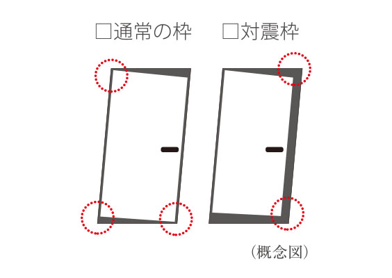 地震時に玄関ドアが開かなくなるトラブルが発生するケースがあります。そこで枠とドアの間に充分なスペースを確保した対震枠を採用し、避難口として確保できるよう配慮しました。
